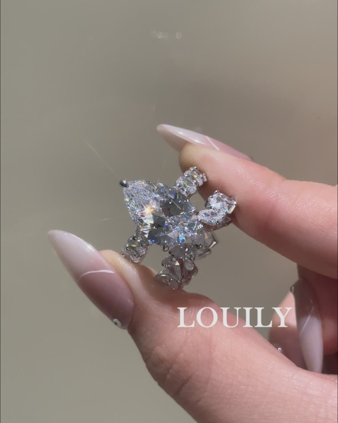 Matching pear-cut side stones along the band create a graceful, flowing rhythm, symbolizing harmony and emotional connection. The layered design offers a balanced look that feels both luxurious and wearable.
