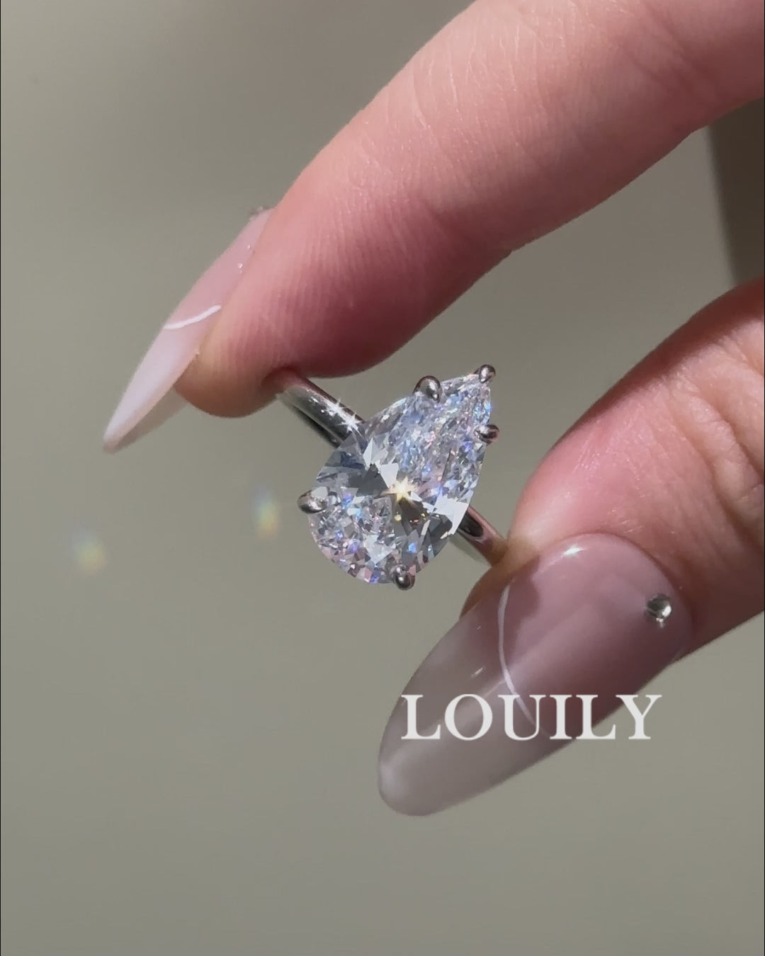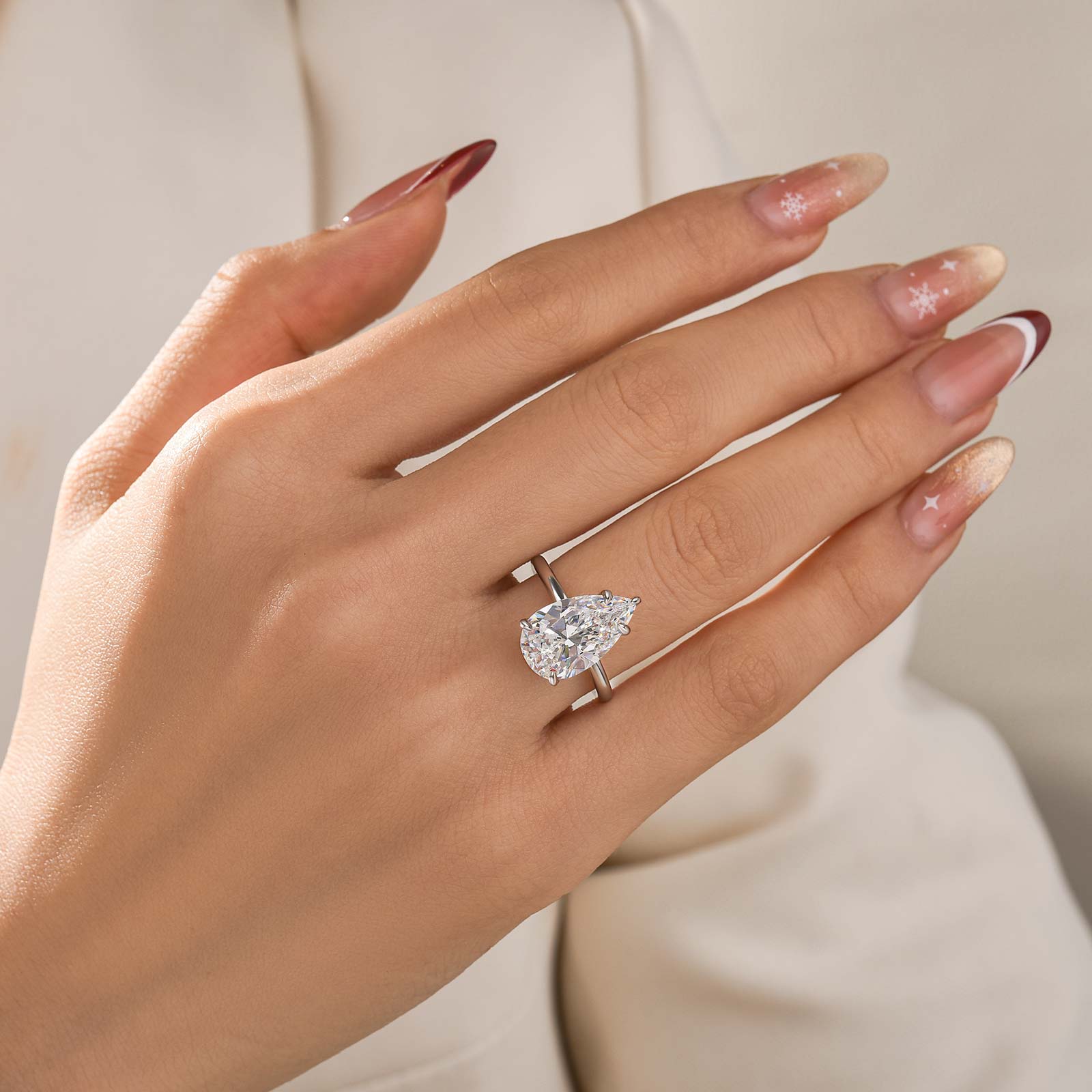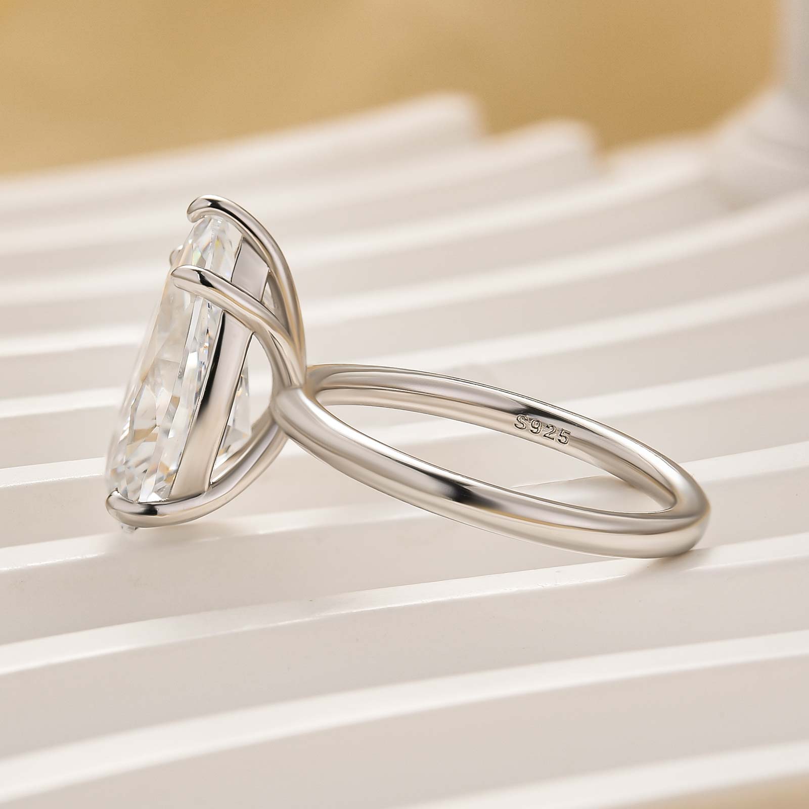 This engagement ring features a 4.5Ct pear-cut center stone set in sterling silver, designed to capture light from every angle. Its slender band and elongated shape create a flattering, graceful silhouette, making it perfect as a standalone statement or paired with other travel rings for a layered, sophisticated look.