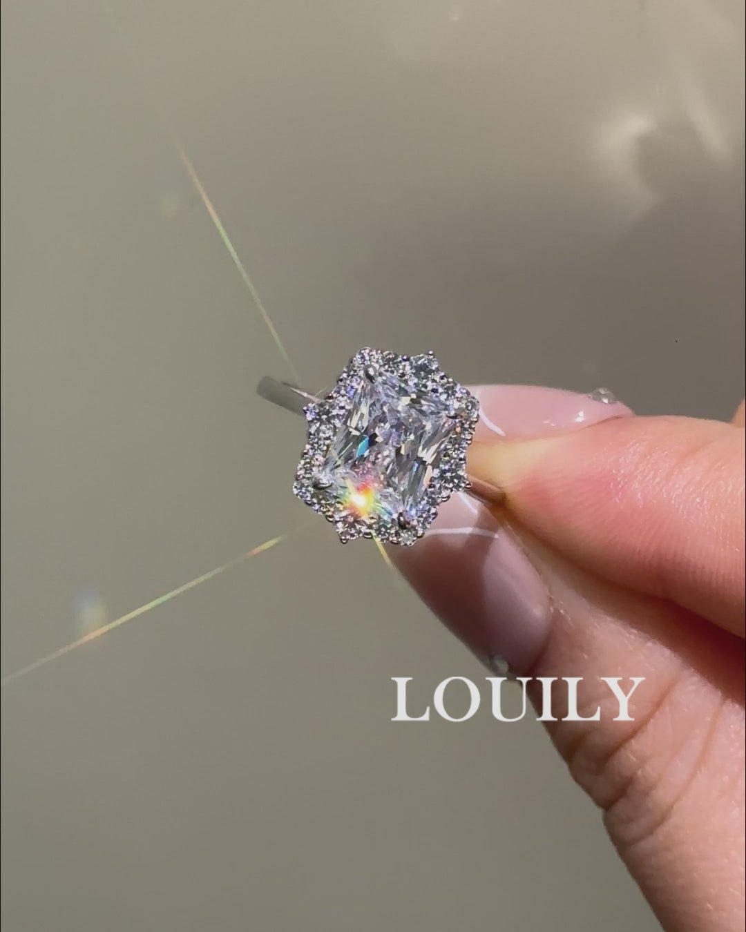 Make a statement with this Louily engagement ring. The classic radiant cut of the faux diamond and accompanying halo setting bring dramatic brilliance to this timeless piece. Perfect for the risk-taker, this bold, sterling silver ring will shine brighter than your wildest dreams!
