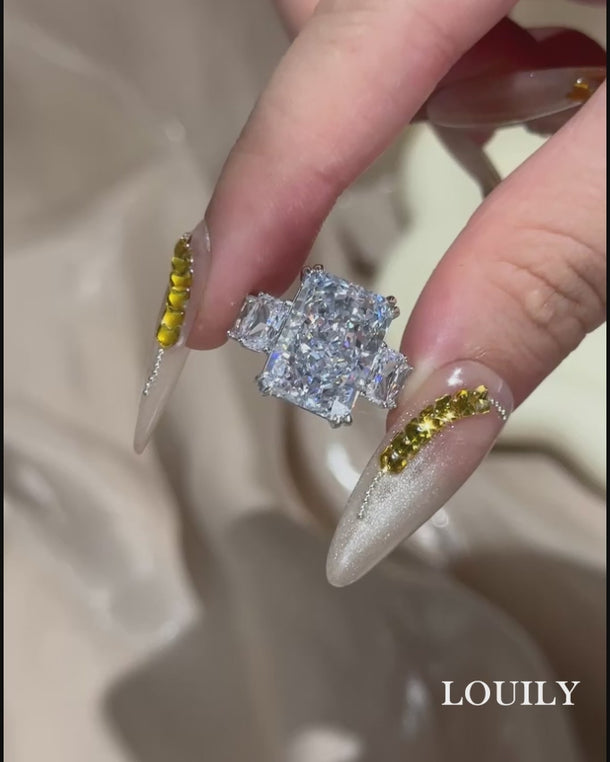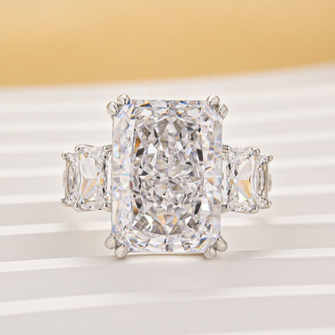 This ring showcases a commanding 10.0 carat radiant cut center stone, flanked by two perfectly matched side stones for a classic three-stone design that symbolizes your past, present, and future. Crafted in sterling silver, it’s a luxe piece that radiates timeless charm and refined brilliance.