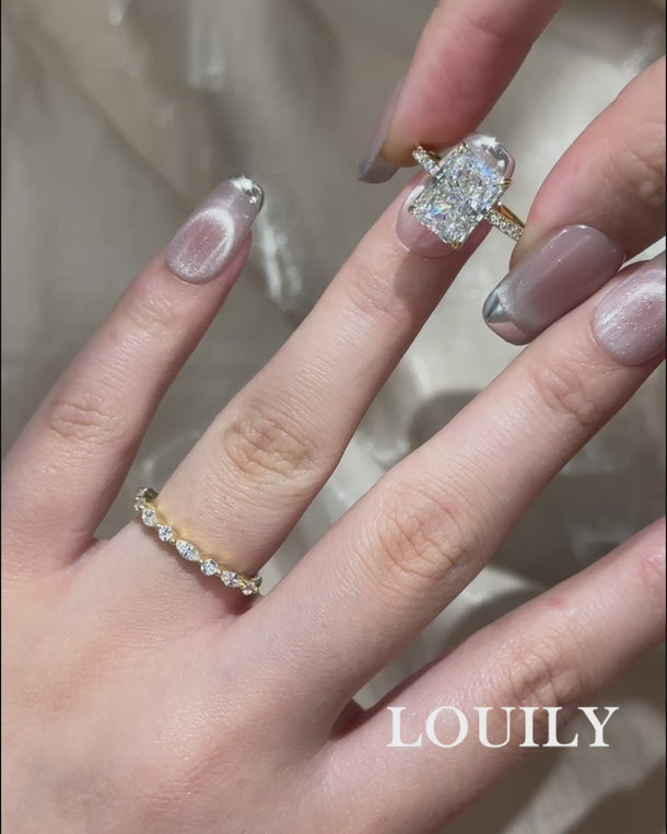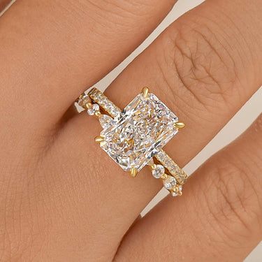 Design Inspiration:Inspired by the quiet magic of light beneath the surface, the 4.5 Carat Radiant Cut Hidden Halo Wedding Set embodies the beauty of love that shines from within. At its heart lies a radiant-cut center stone, celebrated for its crisp edges and dazzling fire—an emblem of strength and brilliance. Encircling it, a delicate hidden halo of fine pavé diamonds adds a secret shimmer, symbolizing the unseen tenderness that sustains true devotion. It crafted for the one whose love story glows quietly, yet endlessly bright.