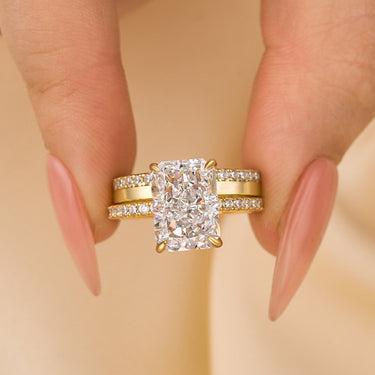 The 2PC Yellow Gold 4.5Ct Radiant Cut Wedding Ring Set with Wide Wedding Band is a stunning display of luxury and elegance. At the heart of the set is a brilliant 4.5ct radiant-cut center stone, whose dazzling facets create a captivating sparkle, perfectly complemented by the rich warmth of yellow gold. The wide wedding band, designed to enhance the center stone, features a sleek and polished finish, offering a bold yet refined look that adds both depth and sophistication to the set.