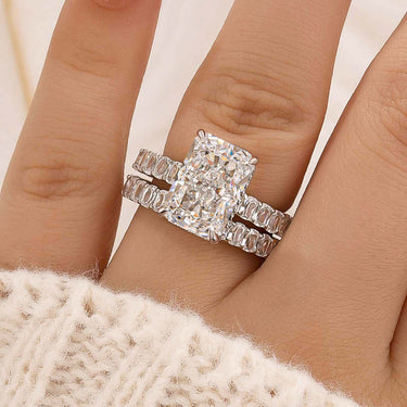 This set features a striking 5.0Ct radiant-cut engagement ring paired with a matching eternity wedding band, creating a continuous circle of brilliance. The radiant cut’s clean lines highlight the stone’s clarity, while the eternity band adds timeless elegance, making this duo ideal for celebrating a love that lasts forever.