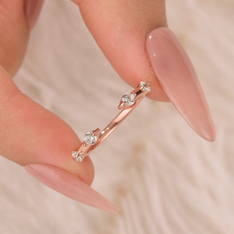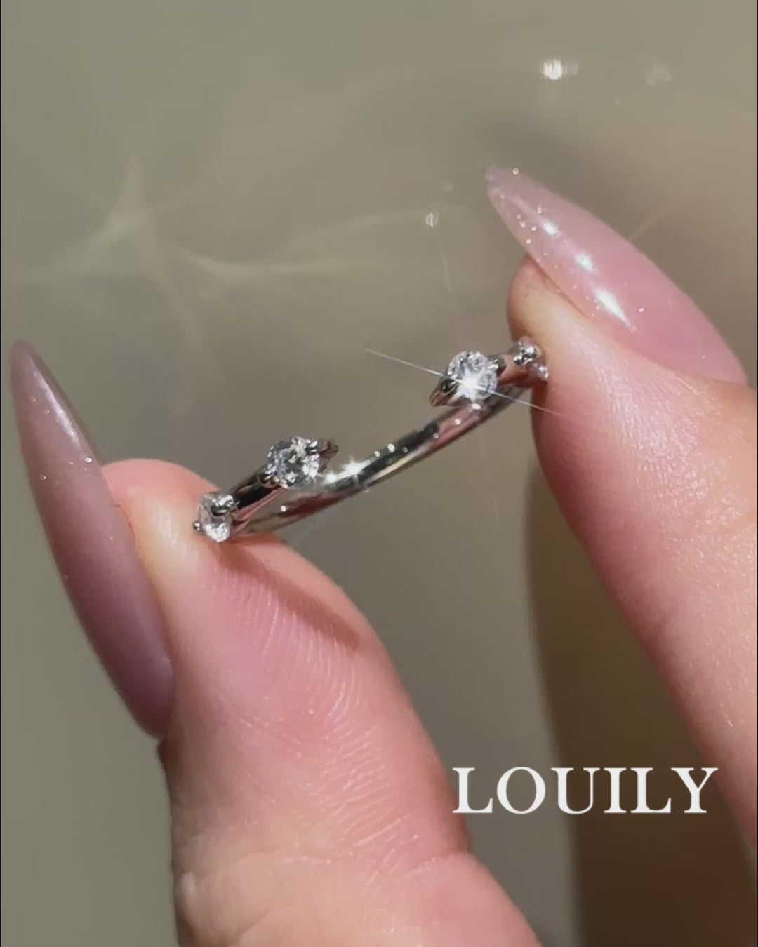 This ring was designed for the woman who loves timeless simplicity with a contemporary edge, featuring a classic round cut stone arrangement on an open band silhouette. Crafted in sterling silver, it offers a delicate sparkle and a unique shape that makes it perfect for stacking or wearing solo as a subtle statement piece. Ideal as a wedding band or a chic everyday accessory, it’s a versatile addition to any jewelry collection.