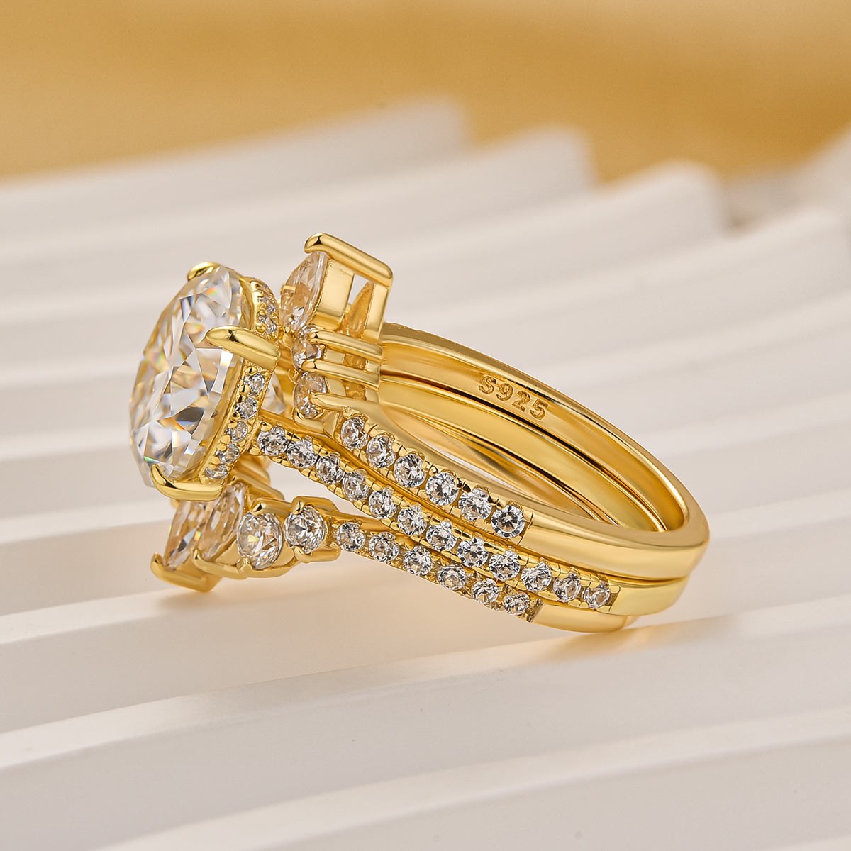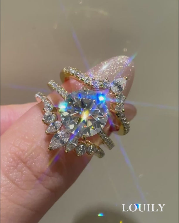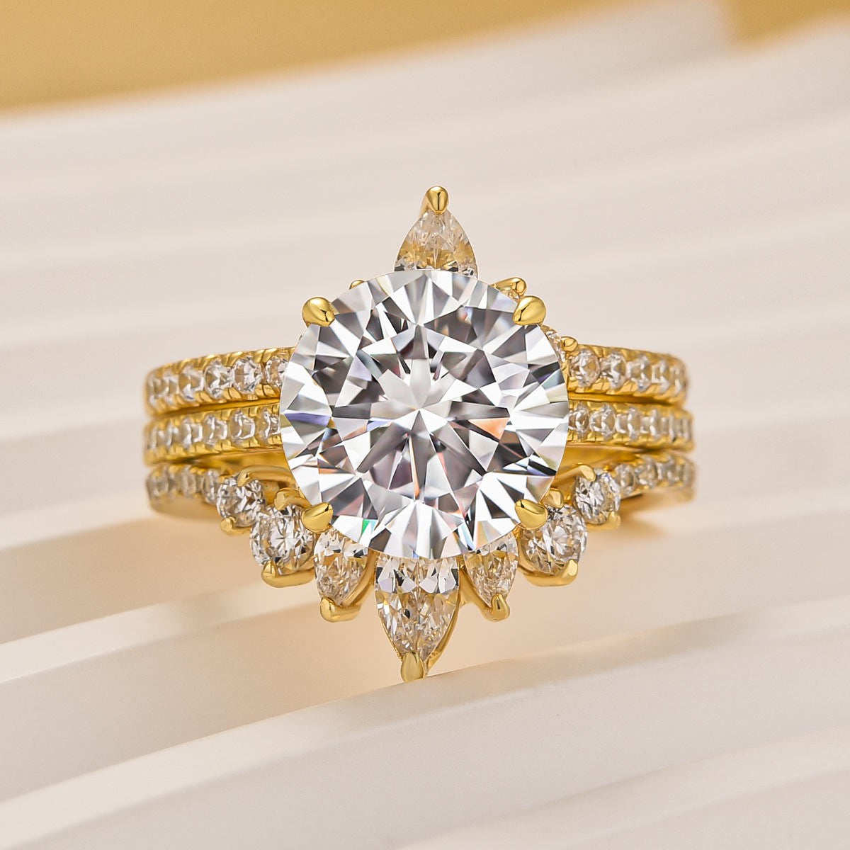This 3PC 4.0 carat round cut wedding ring set features a dazzling round center stone complemented by two curved wedding bands that hug it beautifully. The combination creates a seamless, elegant silhouette, highlighting the center stone while adding dimension and versatility for stacking or everyday wear.