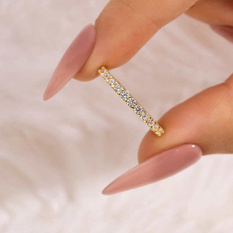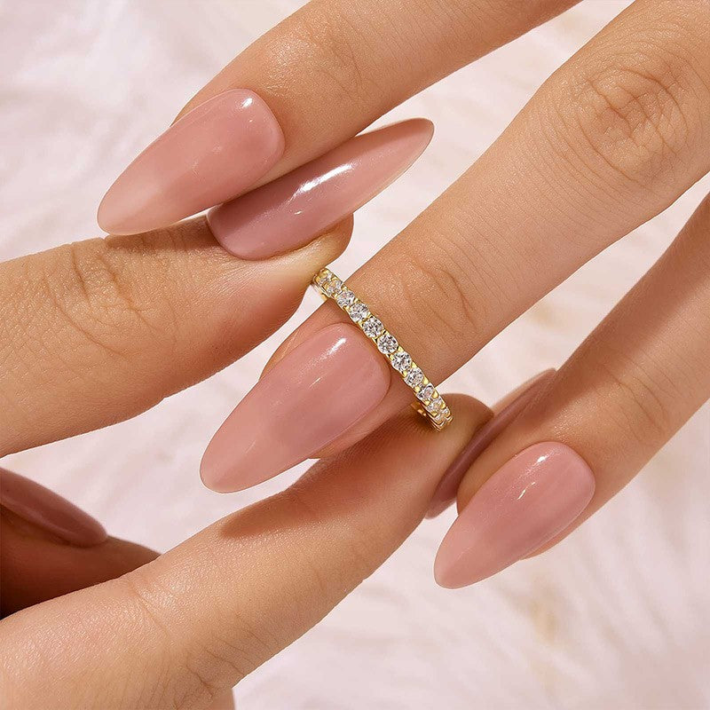 This ring was crafted for the woman who appreciates understated beauty, featuring 0.6 carats of brilliant round cut moissanite stones set in a graceful half-band design. Made from sterling silver, it’s perfect as a wedding band, stacking piece, or elegant travel ring—adding just the right touch of shimmer to any look. Whether worn alone or paired with your engagement ring, it brings a timeless charm to every moment.