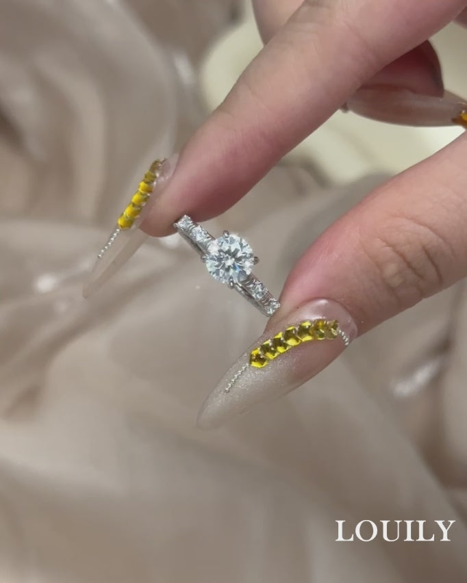 It blends classic charm with modern refinement. Featuring a brilliant 1.2 carat round cut moissanite, this ring sparkles with fire and clarity that rivals traditional diamonds. The sleek white gold-finished setting enhances its brilliance while offering a contemporary, polished look.