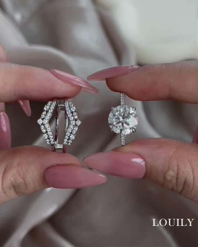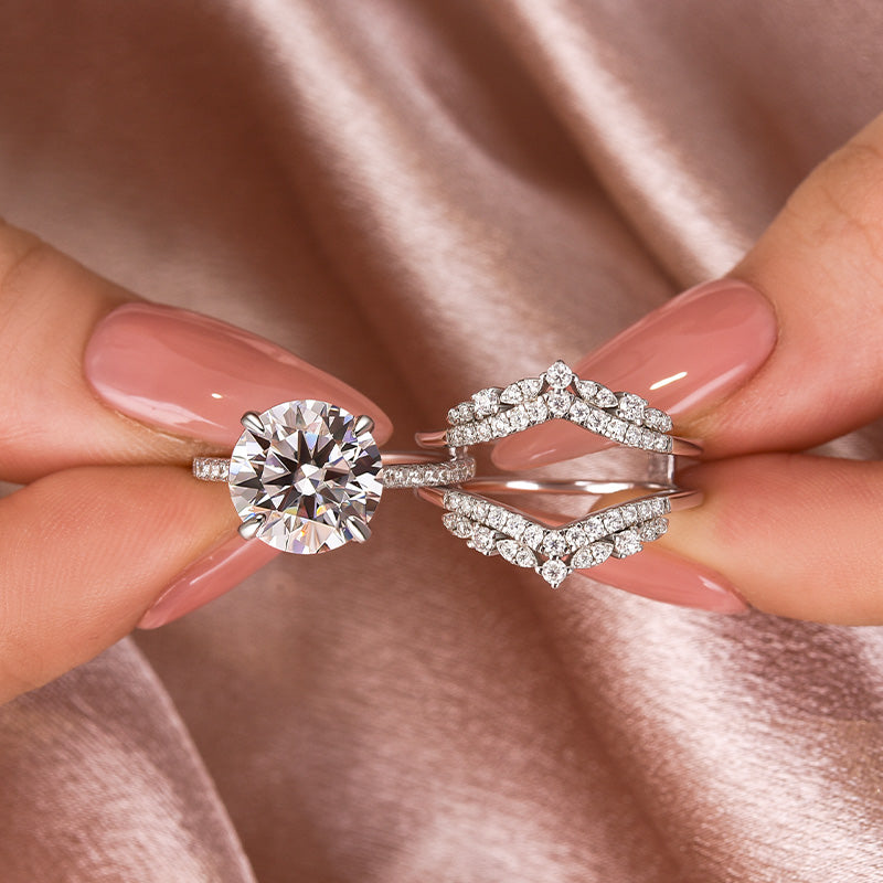 The Moissanite 4.0CT Round Cut Insert Wedding Ring Set With Jacket Stack Wedding Band is a striking testament to the brilliance of love and luxury. The 4.0-carat round-cut moissanite center stone dazzles with an unparalleled sparkle, casting a breathtaking glow from every angle. Its radiant beauty is complemented by the stunning stackable band jacket, which adds a layer of elegance and depth, creating a harmonious and sophisticated look that is both modern and timeless.