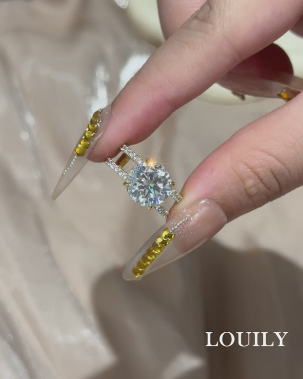 This 4.0Ct round cut moissanite engagement ring in yellow gold is all about bold elegance. The split shank design brings a modern touch while enhancing the brilliance of the round center stone, which catches the light beautifully from every angle. The warm tone of the yellow gold adds richness and charm, making this ring a radiant symbol of love that feels both timeless and eye-catching.