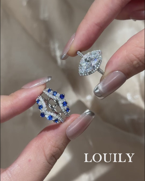 Design Inspiration:Inspired by the celestial balance of moon and stars, this enhancer set tells a story of cosmic harmony. The marquise center stone, embraced by a soft halo, mirrors the crescent moon cradled by twilight. The blue and white stone wedding band echoes the rhythm of night meeting day—a union of two souls dancing between eternity and serenity, forever bound in stellar grace.