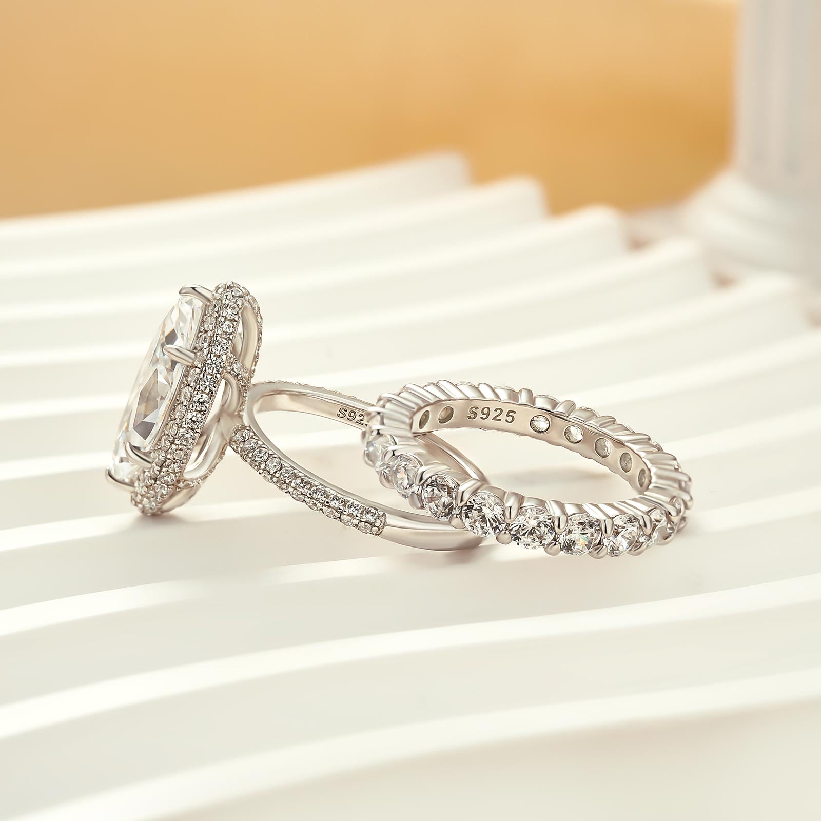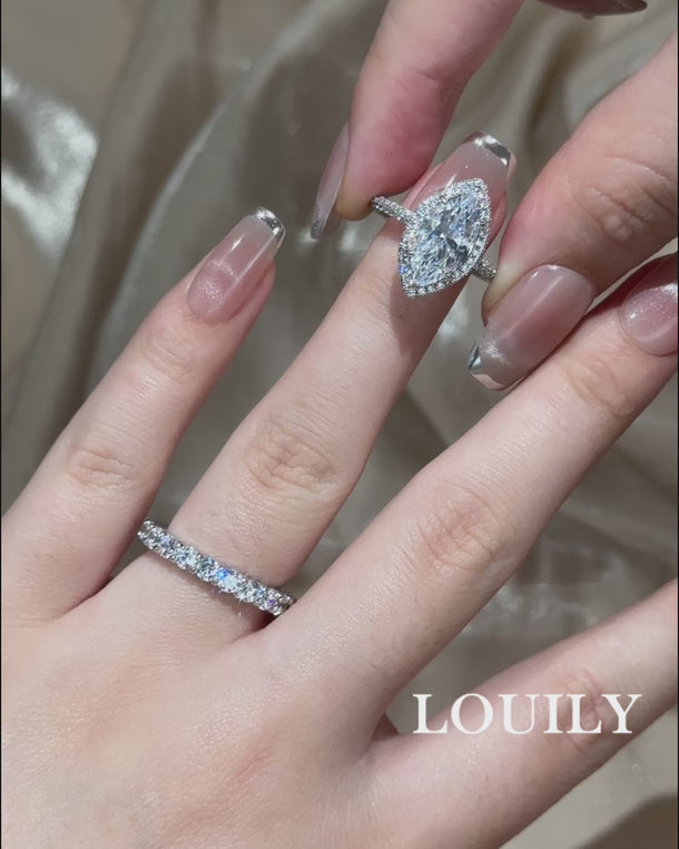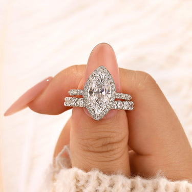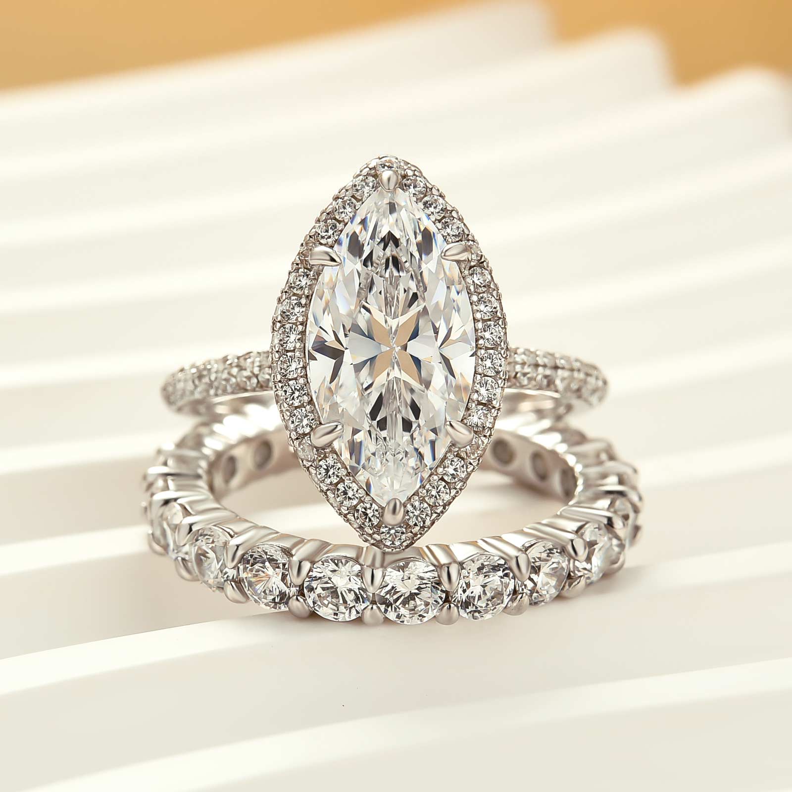 This 3.0Ct halo marquise cut wedding ring set blends elegance and sophistication with striking geometry. The marquise center stone elongates the finger with graceful brilliance, while the halo and eternity round-cut band amplify sparkle and create a layered, luminous effect. Crafted in 18K white gold, the design balances classic charm with modern glamour—celebrating a love that is bold, radiant, and timeless.