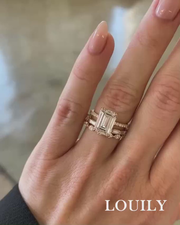 This three-piece ring set was designed for the woman who appreciates clean lines and timeless shapes, featuring a stunning 3.5 carat emerald cut center stone complemented by a marquise cut wedding band and a matching emerald cut wedding band. Crafted in sterling silver, each piece offers a unique silhouette that harmonizes perfectly, making this set ideal for both special occasions and everyday wear. Celebrate your journey with a look that’s bold yet elegant.