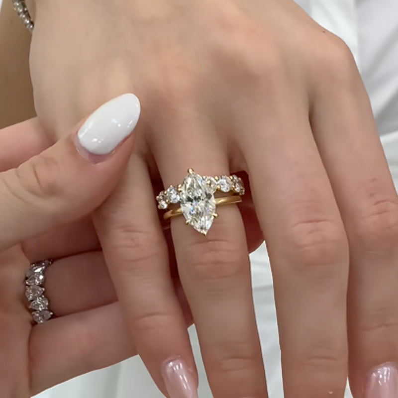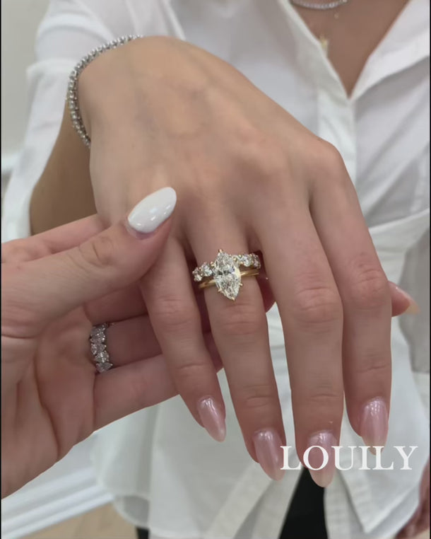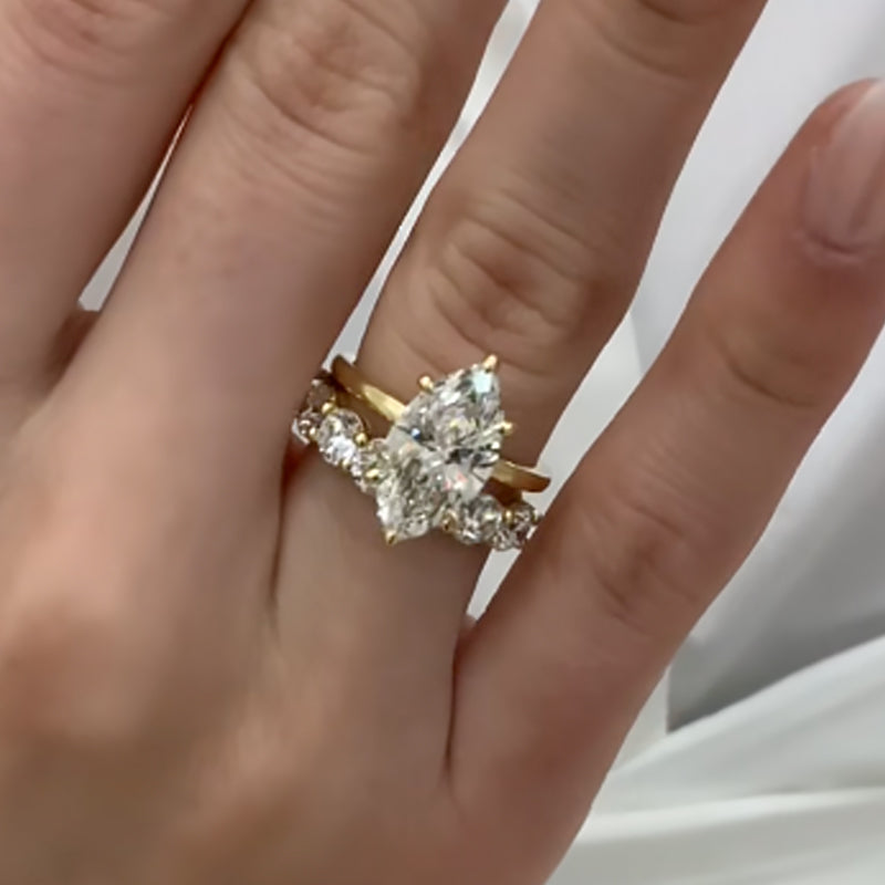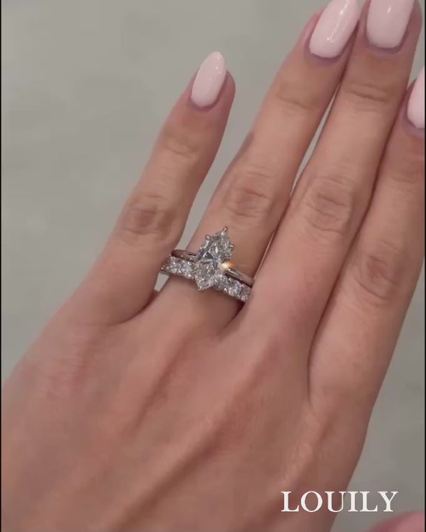 This 4.0Ct marquise cut hidden halo engagement ring is designed to captivate with its elongated silhouette and sparkling hidden halo that enhances its brilliance from every angle. Paired with a classic wedding band, the set creates a timeless and graceful look that’s perfect for marking life’s most meaningful moments.