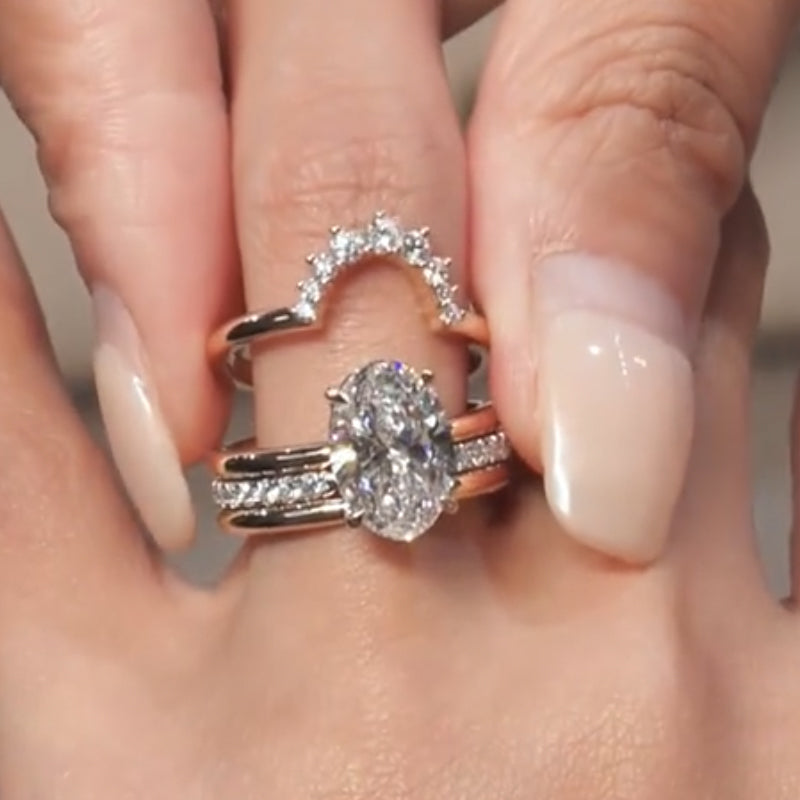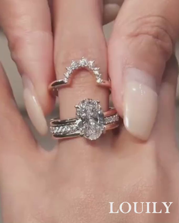 This ring set was thoughtfully designed for the woman who values elegance with a hint of vintage flair, featuring a radiant 4.0 carat oval cut center stone that embodies enduring love. The set includes one vintage curved wedding band, one open wedding band, and one plain wedding band—each complementing the engagement ring while offering versatile styling options. Whether worn as a complete set or mixed to suit your mood, it’s a stunning choice for engagements, weddings, or travel.
