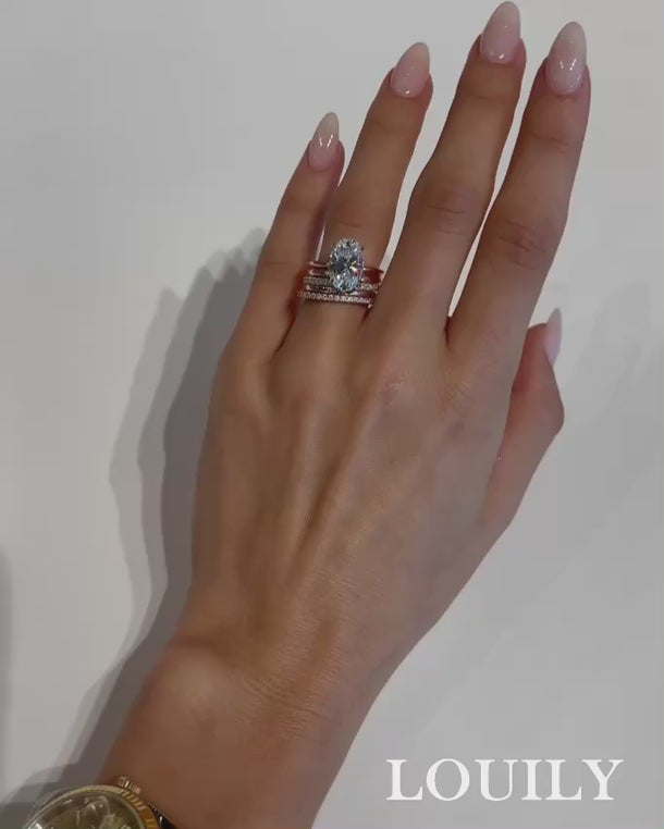 This 5PC wedding ring set showcases a dazzling 4.0Ct oval cut centerpiece, perfectly complemented by four classic wedding bands that allow endless styling options. The oval cut radiates sophistication, while the stackable bands provide flexibility to mix, match, or layer for any occasion.
