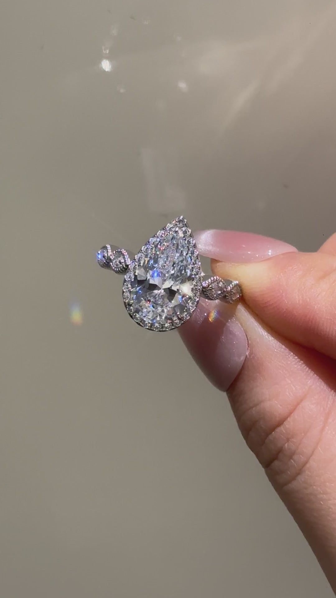 Design Inspiration:This design is inspired by the freedom to carry love wherever life leads. The pear-shaped center stone blends softness and brilliance, symbolizing emotional depth, grace, and new beginnings. The surrounding halo enhances its sparkle, reflecting cherished memories that illuminate every journey. Crafted with a refined silhouette and lightweight elegance, the design captures the balance between beauty and practicality, making it a radiant expression of love meant to shine in every moment.