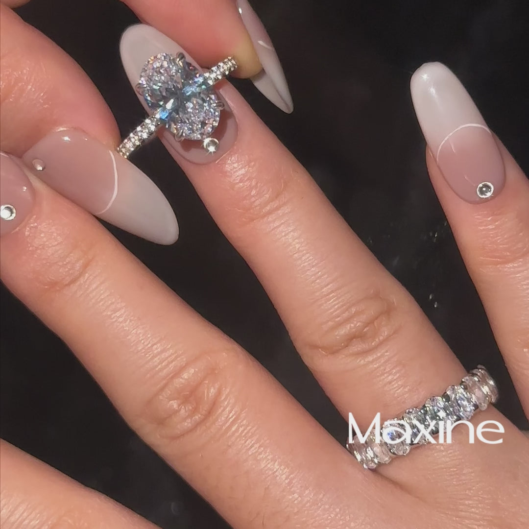 At the center features a 4.0-carat oval-cut simulated diamond, admired for its soft curves and radiant brilliance. The classic four-prong setting lifts the stone to capture light from every angle, creating a graceful and eye-catching sparkle.