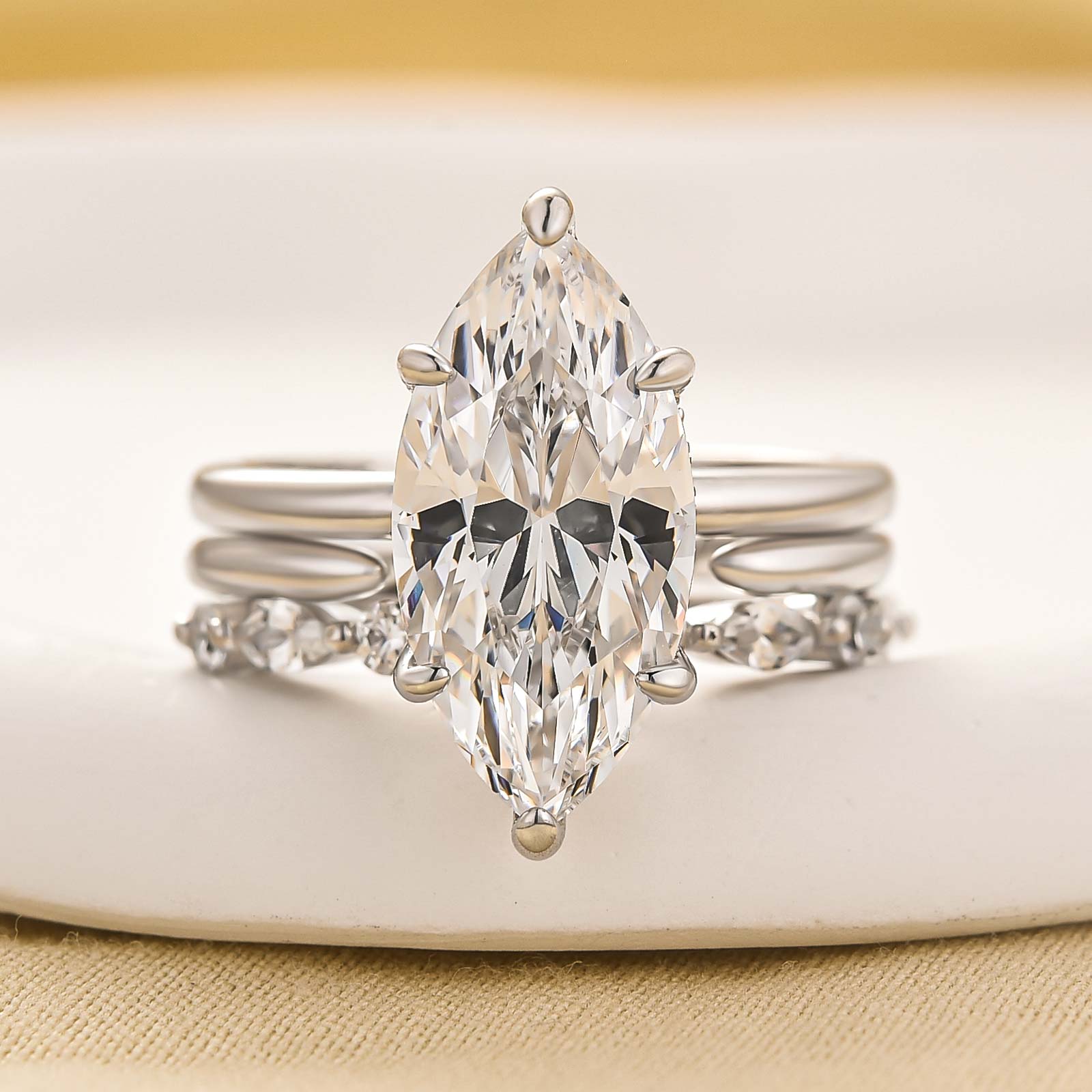 Design Inspiration: Designed with a modern open silhouette, this 4.0ct marquise-cut simulated diamond ring set features a radiant center stone secured in a classic 5-prong setting. Accented with marquise-cut side stones, the 3-piece design creates a balanced, layered look with enhanced brilliance. Crafted in 925 sterling silver with 18K white gold plating and rhodium finish, this wedding ring set delivers lasting shine and lasting comfort. Perfect as a promise ring, travel ring, or engagement and wedding set for women who love contemporary elegance and versatile styling.