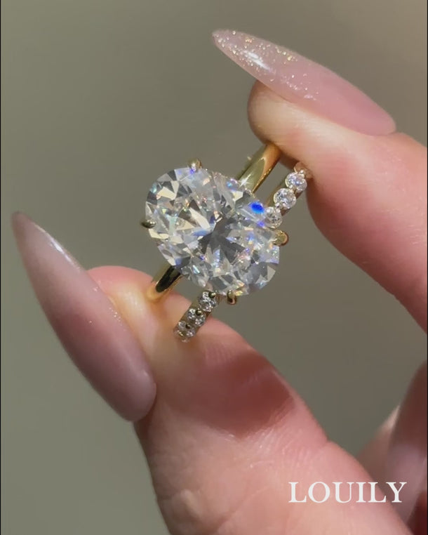 It is the perfect fusion of classic charm and modern sparkle. At its heart lies a breathtaking 5.5 carat oval cut moissanite that radiates brilliance from every angle, enhanced beautifully by the warmth of yellow gold.