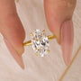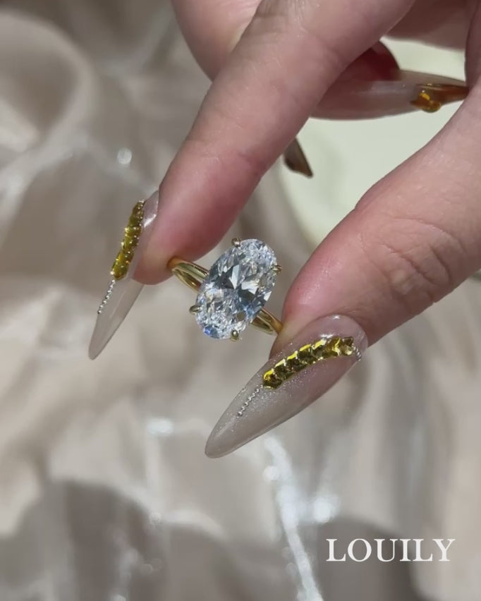 This ring showcases a stunning 5.0 carat oval cut center stone, enhanced by a hidden halo that adds subtle brilliance from every angle. Crafted in sterling silver, it offers classic beauty with a modern twist—perfect as a travel ring or a breathtaking stand-in for your engagement ring.