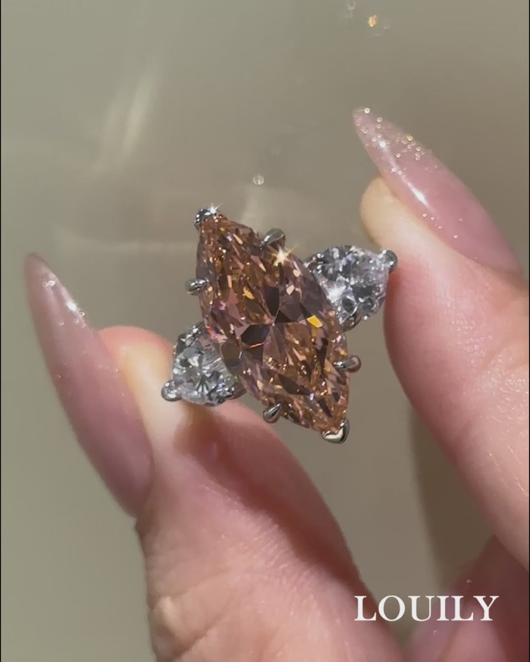This engagement ring features a 6.0-carat marquise-cut center stone flanked by two sparkling side stones. The elongated marquise cut flatters the finger, while the three-stone arrangement adds depth and meaning, making it perfect for someone who loves a classic design with striking presence and lasting elegance.