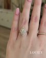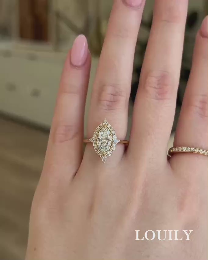 This vintage engagement ring travel ring for her radiates timeless elegance, with the elongated marquise cut center stone shimmering in a halo of sparkling accents. It’s a design that feels both graceful and eye-catching, perfect for women who adore unique vintage-inspired beauty.