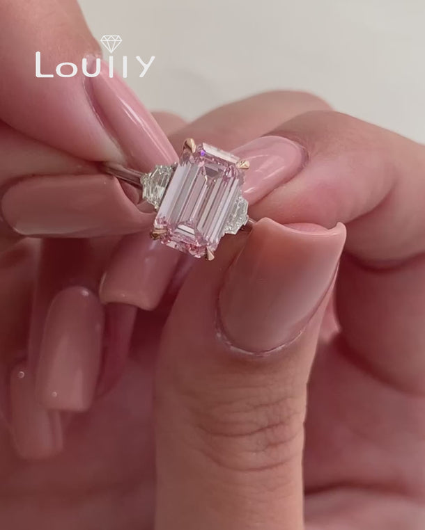Louily Gorgeous Emerald Cut Morganite Pink Three Stone Engagement Ring In Sterling Silver