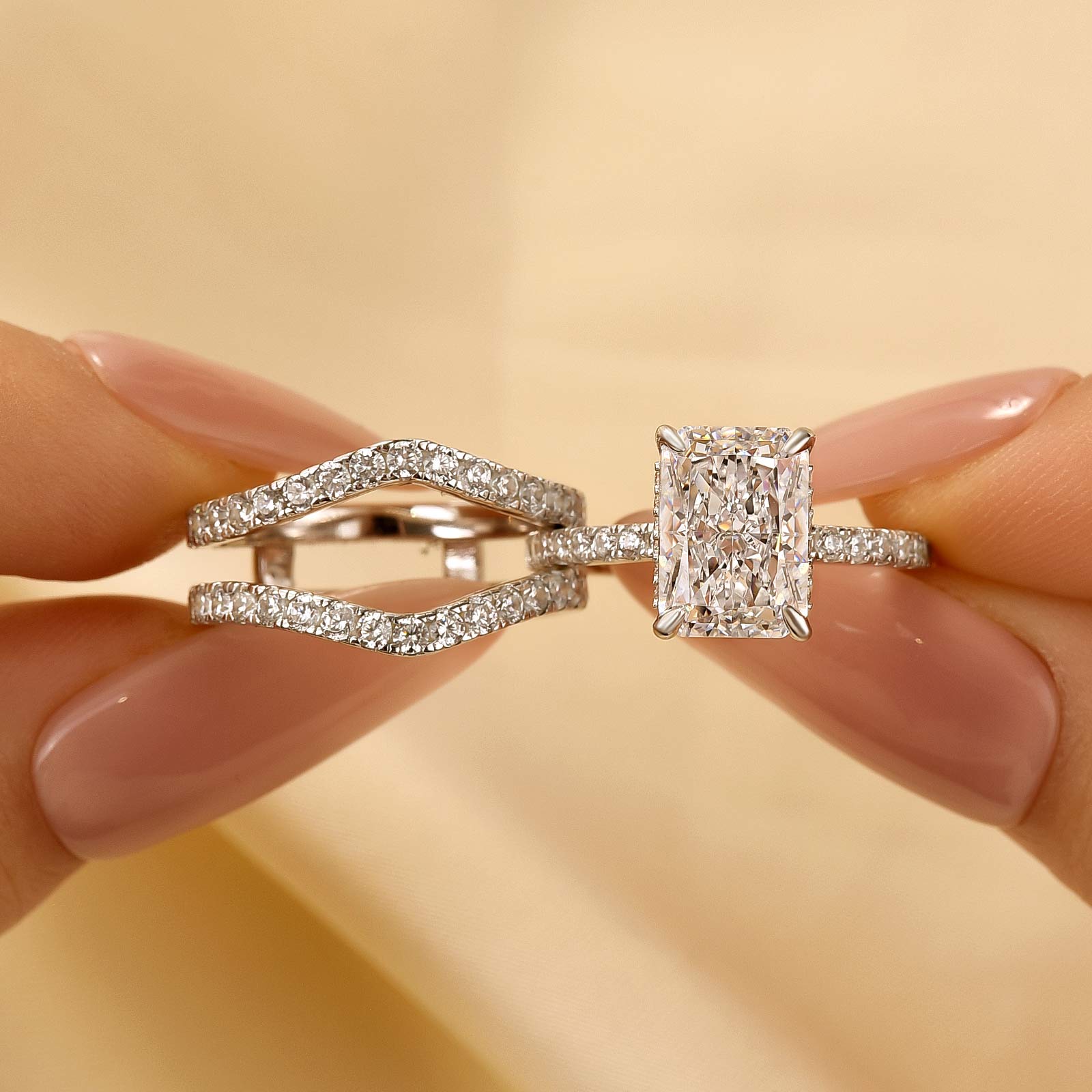 Design Inspiration:This design embodies modern sophistication with a radiant-cut center stone that dazzles from every angle. Its brilliant facets create a striking focal point, while the enhancer band gently embraces the centerpiece, adding layered sparkle and a seamless, unified look. Together, they form a bold yet elegant set—perfect for those who love timeless style with a contemporary edge.