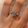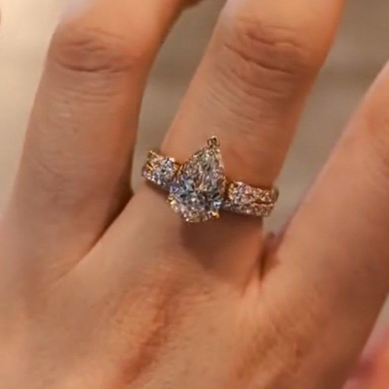 This 3.0Ct pear cut insert wedding ring set features a stunning pear-shaped engagement ring, paired with an open engagement ring enhancer that frames it beautifully. The enhancer adds depth and sparkle, giving the set a unique layered look while highlighting the pear cut’s graceful silhouette.