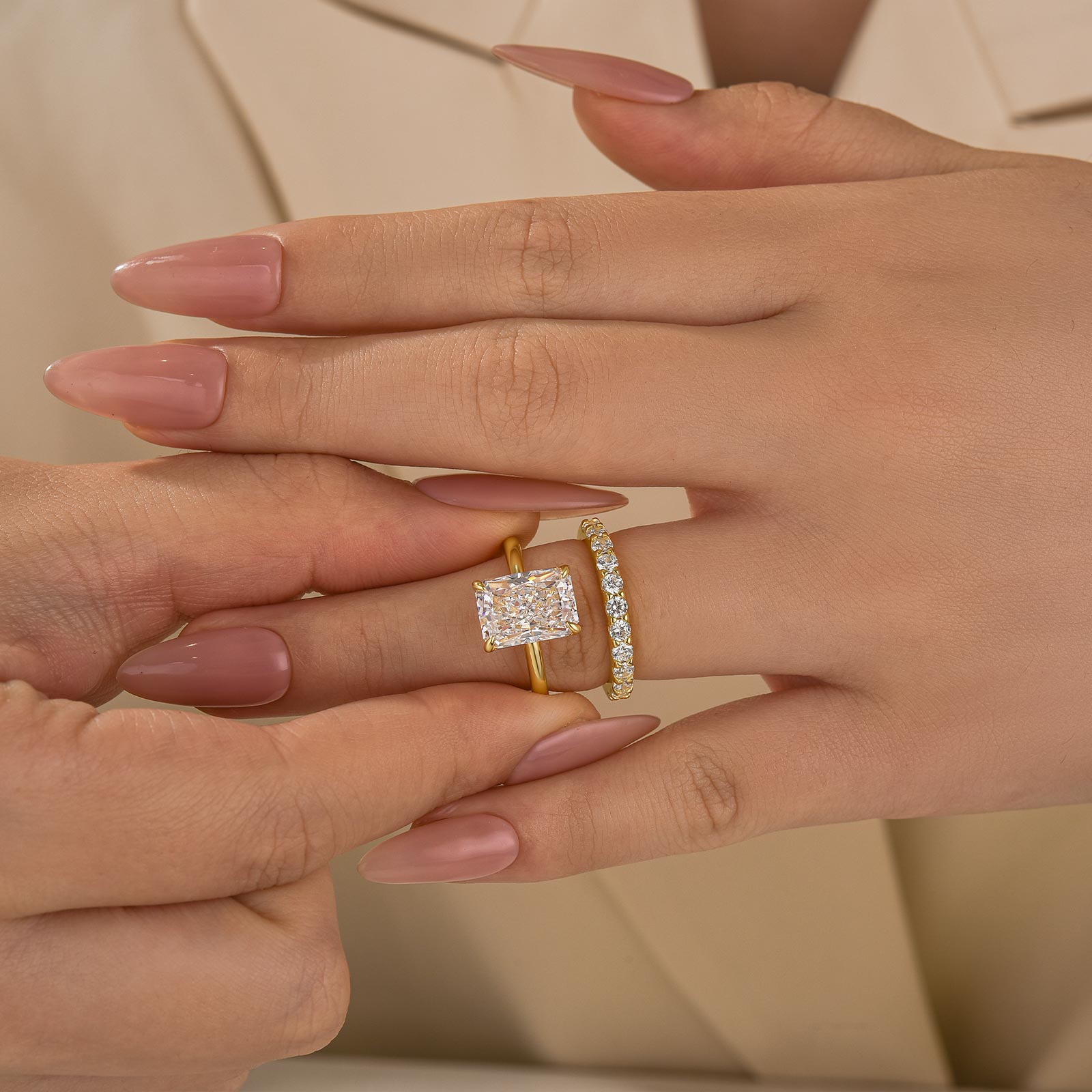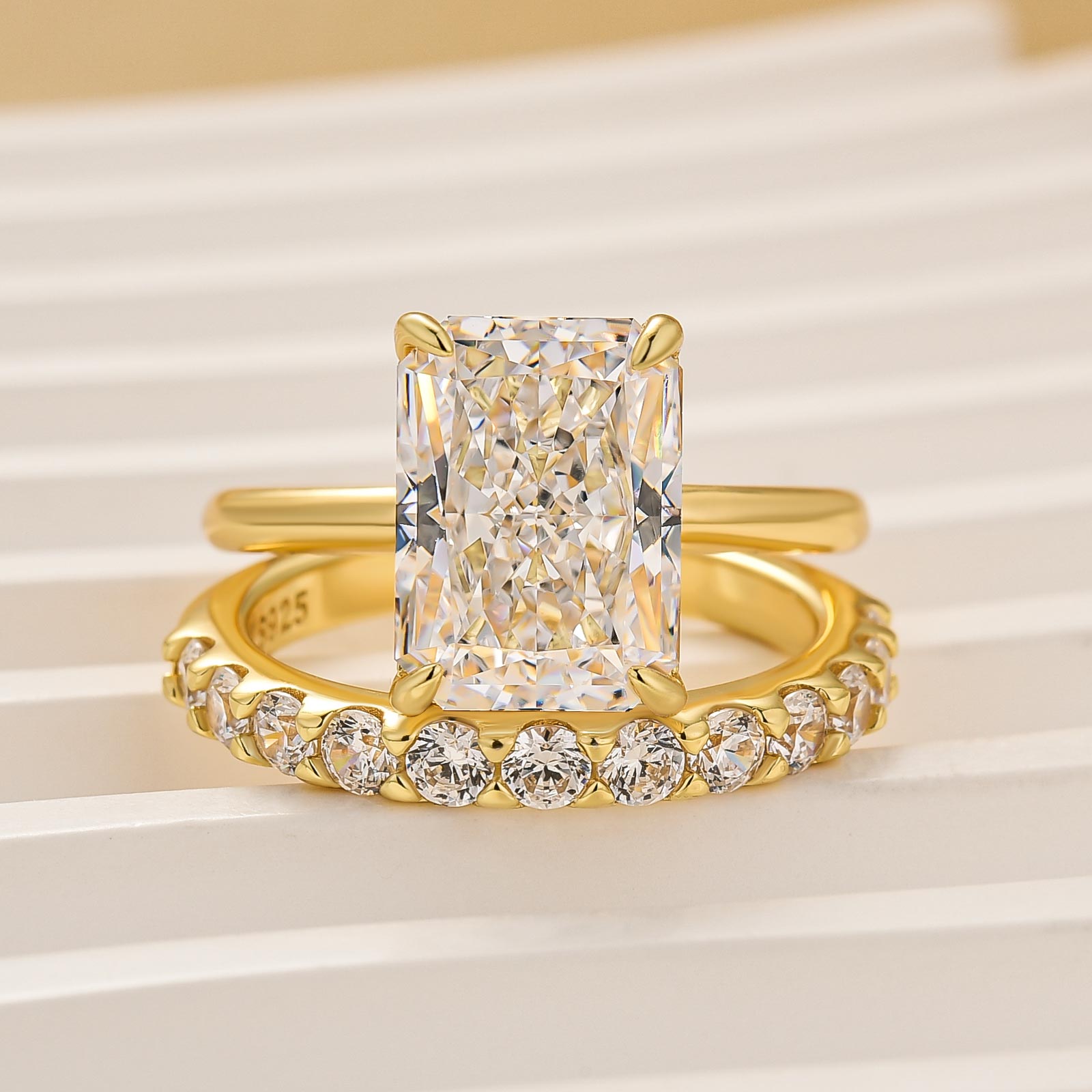 The 4.5Ct radiant-cut solitaire shines with clean, commanding brilliance. A slim round-cut band adds refined shimmer, completing a look that feels modern, confident, and effortlessly iconic—made for women who define their own timeless style.