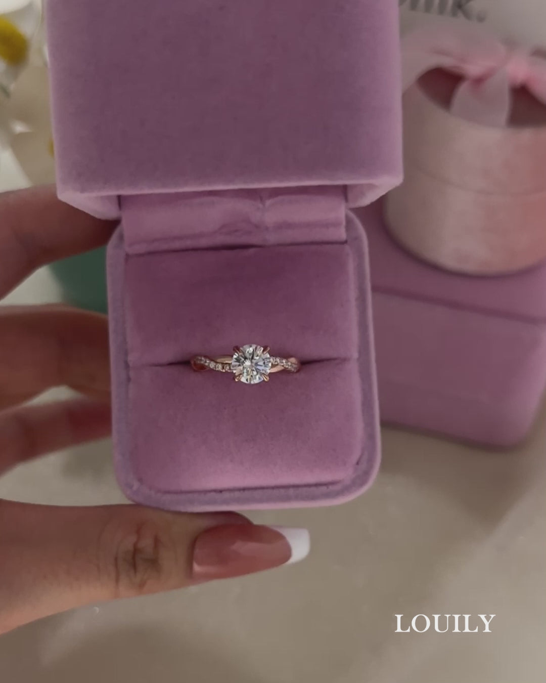 A twist engagement ring featuring two bands intertwined together. The center stone is round cut and held by four delicate prongs. This ring is also available in yellow gold, and rose gold. This dainty Twist ring takes a hint of inspiration from vines found in nature, making it a romantic choice for two people whose paths are destined to be interwoven.