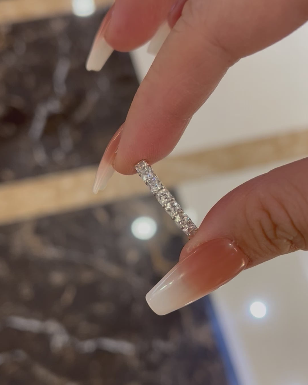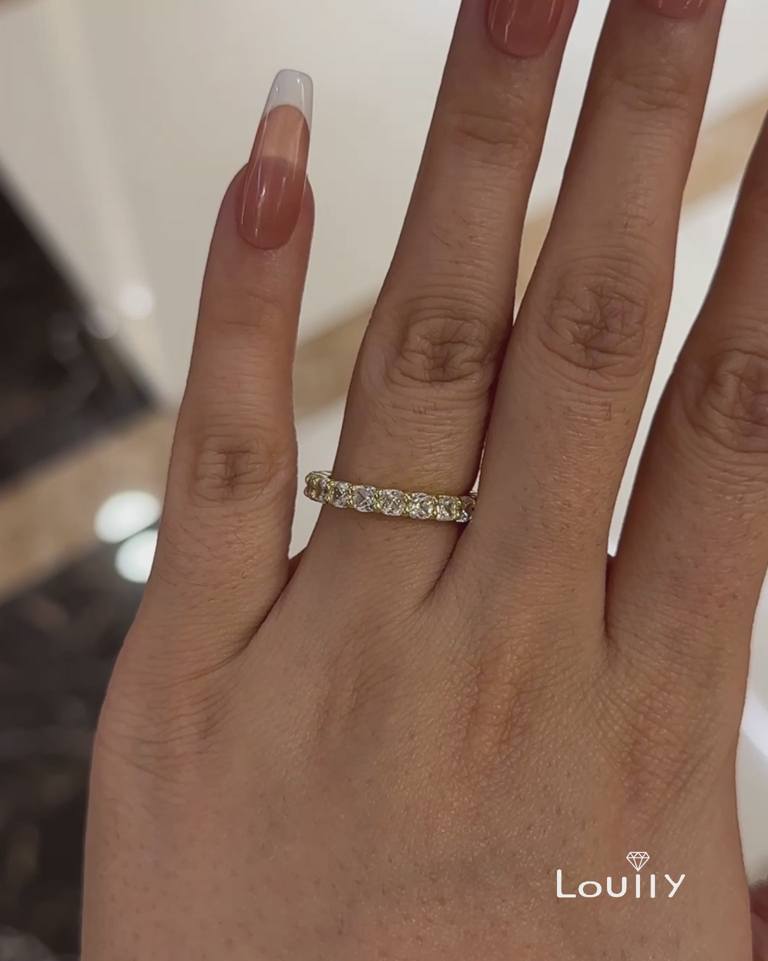 Celebrate your everlasting love story with a eternity band. Stunning as a wedding or anniversary band, this band shimmers with prong-set cushion stones that completely surround the band. This exquisite style is lovely alone or paired with an engagement ring. Buffed to a brilliant luster, this ring is a beautiful reminder of your timeless romance.