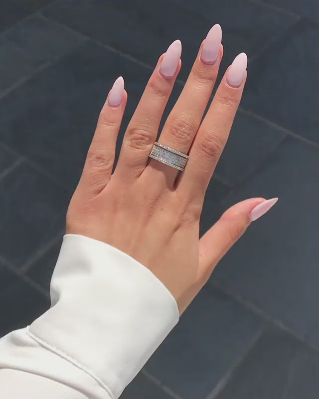 This gorgeous wedding band features a pave setting of stones. The glittering little rocks on the layered, show a really unique look on your hand. An elegant and unusual look, like stars and planets adorning the clear night sky, All the stones sparkle perfectly from every angle, making the ring an eye-catcher everywhere.