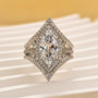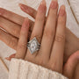 This 3.0Ct halo marquise cut insert wedding ring set is beautifully complemented by a luxe engagement ring enhancer that adds depth and brilliance from every angle. The marquise cut center stone elongates the finger with elegance, while the surrounding halo enhances its radiant glow. The enhancer frames the centerpiece flawlessly, creating a layered look of sophistication.