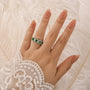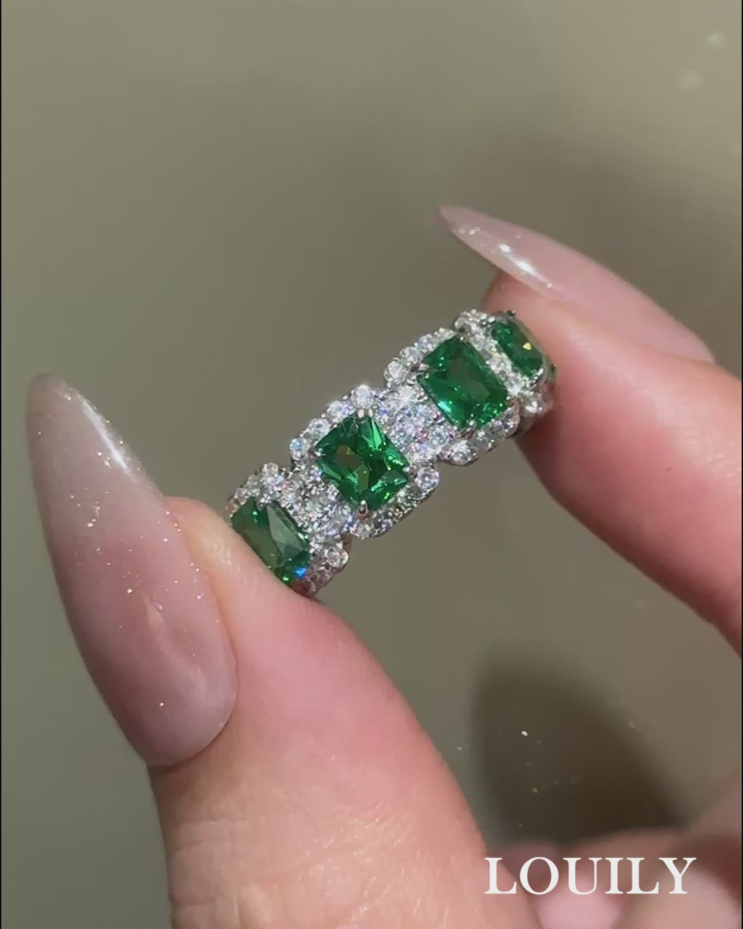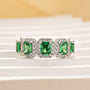 This 3.3Ct anniversary ring showcases a striking emerald cut green stone framed by a radiant halo, all set in sterling silver. The clean lines of the emerald cut highlight the depth of the stone’s color, while the halo enhances its brilliance for a captivating finish.