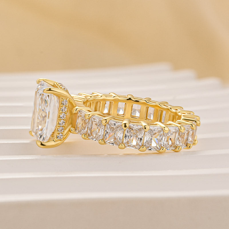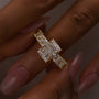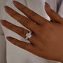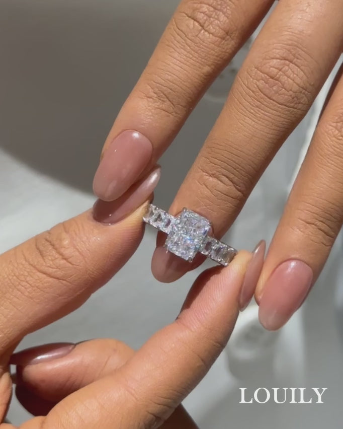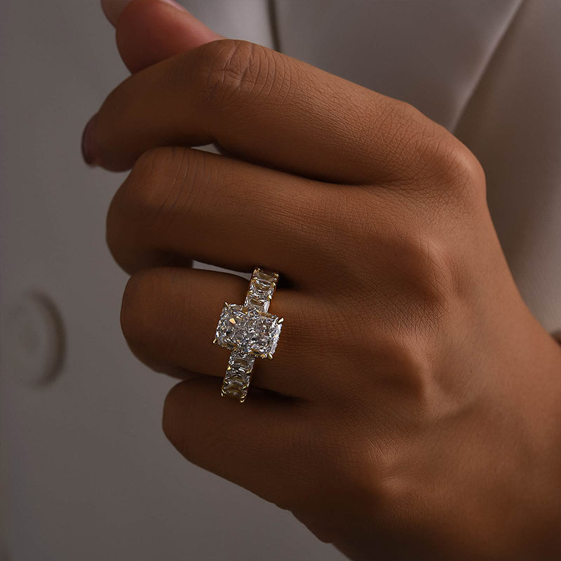 This ring set showcases a 3.5 carat radiant cut center stone that exudes brilliance and sophistication, paired perfectly with a matching radiant cut stone band for a seamless, luxe look. Crafted in sterling silver, it’s a stunning choice for travel or everyday wear—designed to sparkle just like your love story.