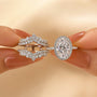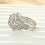 This three-piece ring set was designed for the woman who loves a touch of romance and refined elegance, featuring a dazzling 4.0 carat oval cut center stone framed in a shimmering halo. Paired with two V-shaped half eternity wedding bands, this sterling silver set creates a graceful, layered silhouette that enhances the sparkle and sophistication of each piece. A timeless choice for weddings, anniversaries, or meaningful everyday wear.