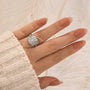 Paired with a perfectly contoured insert ring, this set offers a seamless layered look, framing the engagement ring in a halo of sparkle that enhances its dimension and charm. The design is bold yet balanced, ideal for brides who want something timeless with just the right amount of flair.