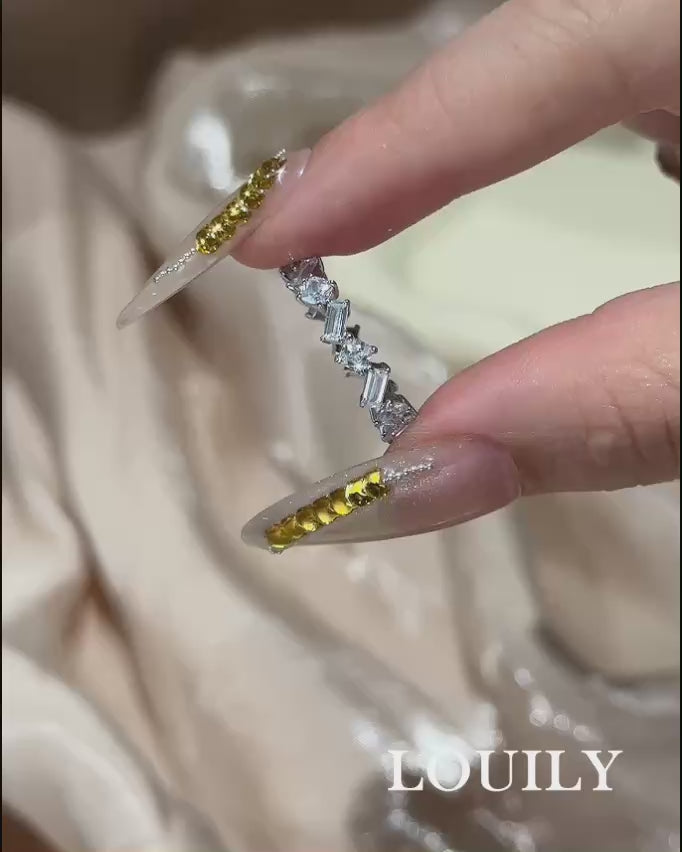 Crafted in bright, polished sterling silver, the setting highlights the distinct beauty of each stone while offering a sleek and modern finish. The mix of cuts adds visual interest and dimension, making it a versatile piece that’s perfect for stacking or wearing on its own.