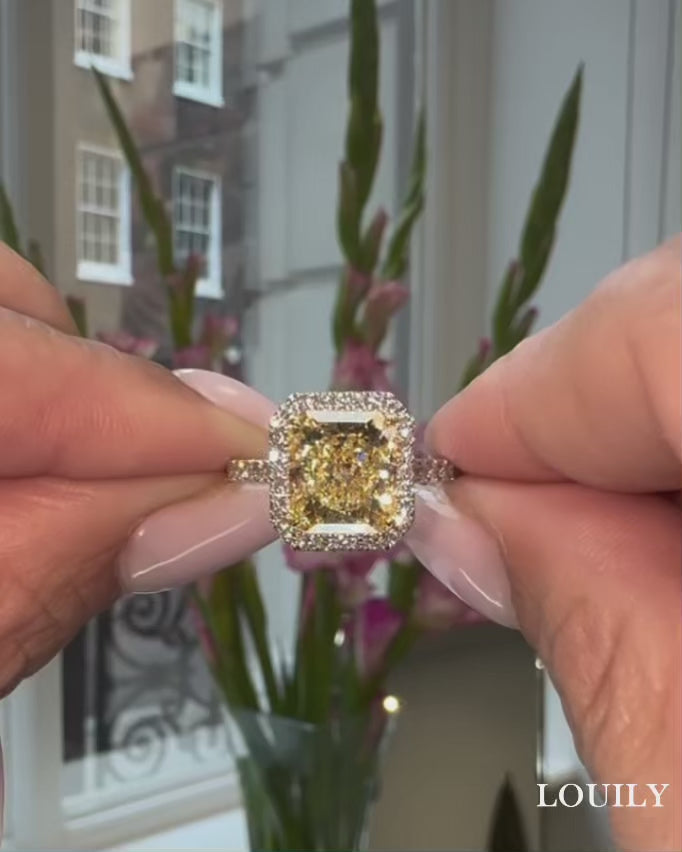 Louily Halo Yellow Stone 5.0Ct Radiant Cut Engagement Ring In Sterling Silver