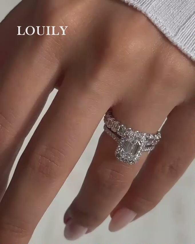 Louily Noble Halo Emerald Cut Wedding Ring Set