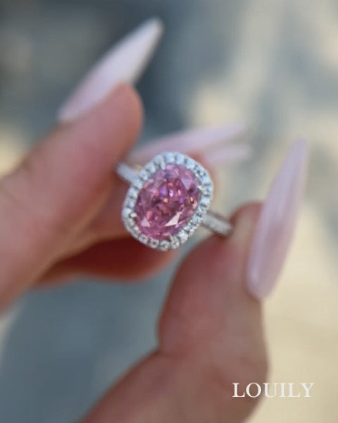 Louily Special Pink Stone Halo Oval Cut Engagement Ring