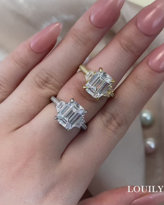 Louily Stunning Emerald Cut Three Stone Engagement Ring In Sterling Silver