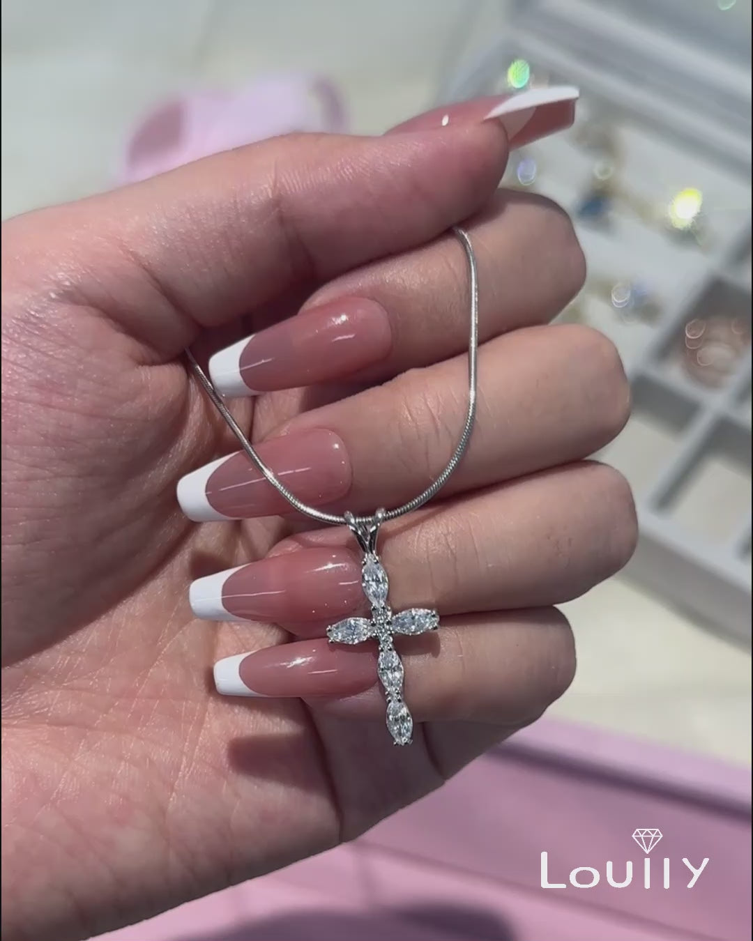 This Louily necklace is an exquisite and unique piece of jewelry. It features a marquise cut cross pendant made of silver, which is delicately encrusted with cubic zirconia crystals for an extra sparkle. Inspired by the world of fashion, this necklace is sure to make a stylish statement.