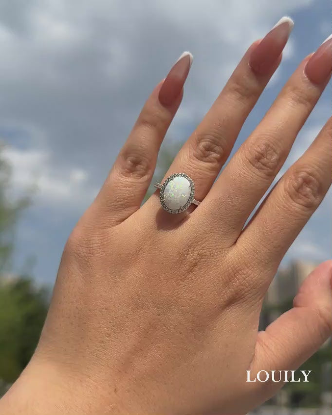 Louily Unique Opal Stone Halo Oval Cut Engagement Ring
