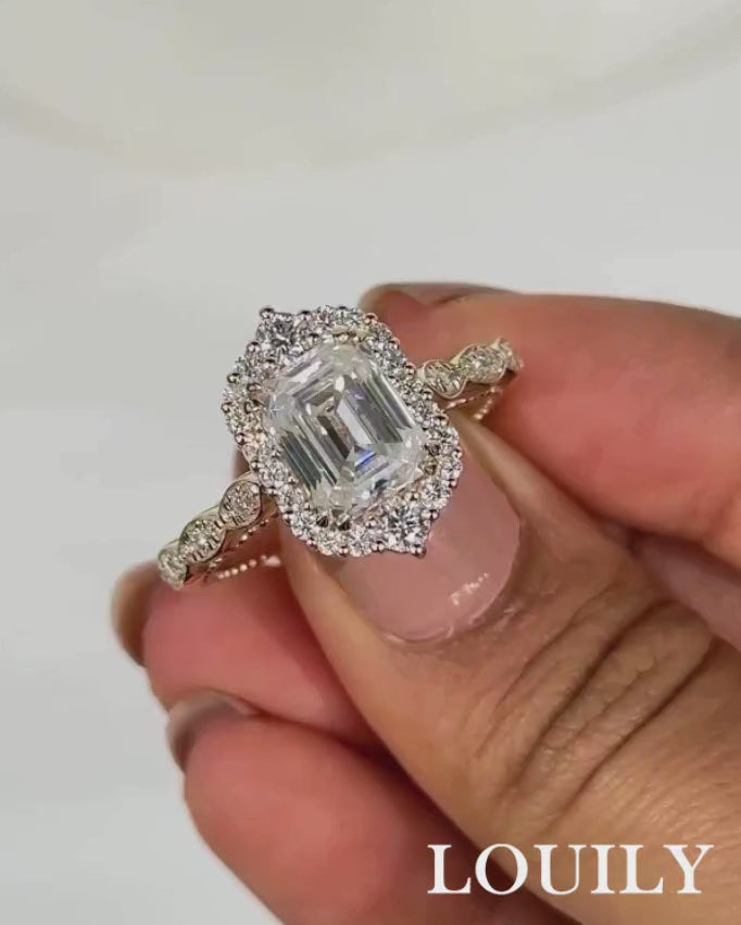 Louily Vintage Halo Emerald Cut Engagement Ring In Sterling Silver