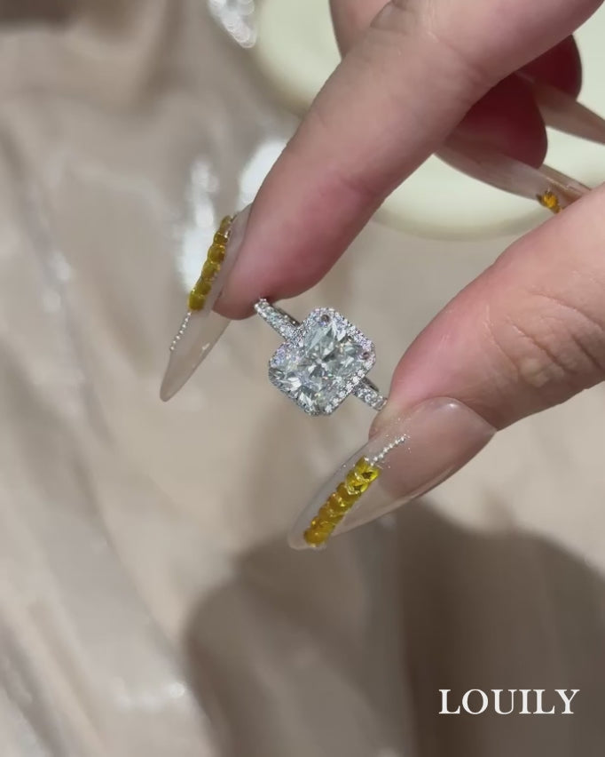 This 3.0 Ct halo radiant cut moissanite engagement ring is designed to turn heads with its exceptional sparkle and clean lines. The radiant cut center stone shines with fire and brilliance, enhanced by a delicate halo that adds depth and luminosity. Crafted in white gold, the setting provides a sleek, luxurious foundation that makes the entire piece feel both modern and romantic. A perfect symbol of commitment, full of elegance and lasting charm.