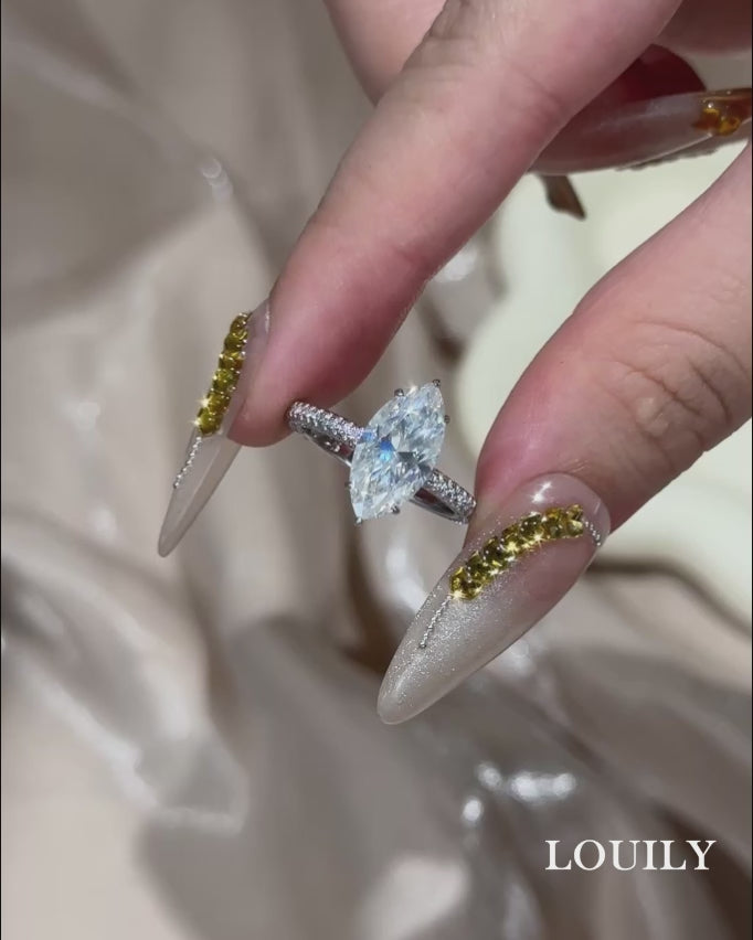 This ring showcases a stunning 3.0 carat marquise cut moissanite, expertly set in timeless sterling silver. The elongated silhouette offers a graceful presence, while the brilliance of moissanite adds a captivating sparkle to every angle—an elegant choice for a love that’s meant to last.