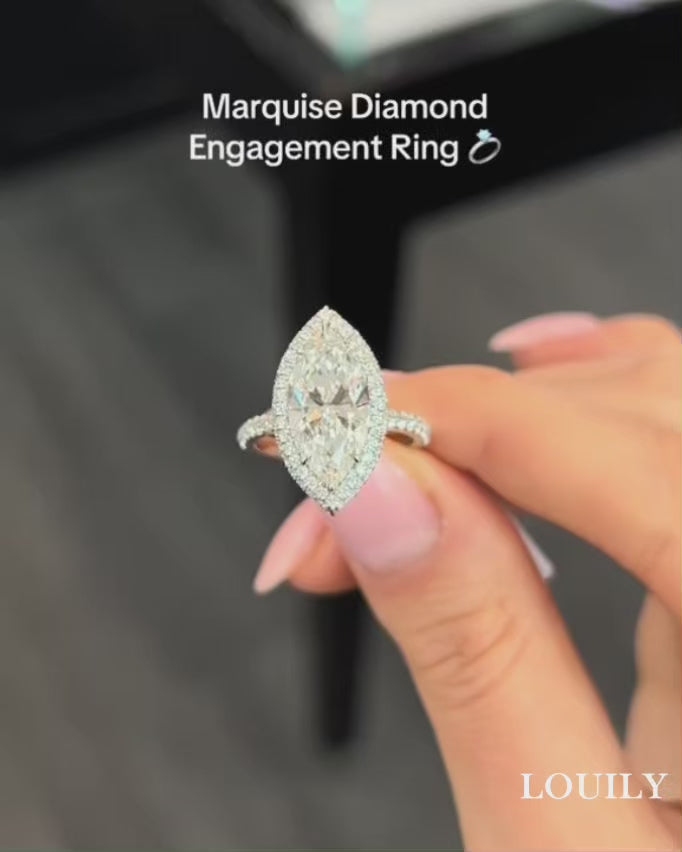 The Unique 3.0Ct Halo Marquise Cut Engagement Ring in Sterling Silver is a dazzling expression of individuality and timeless romance. At its heart is a striking 3.0-carat marquise-cut center stone, known for its elongated, eye-catching silhouette that flatters the finger and radiates vintage charm.