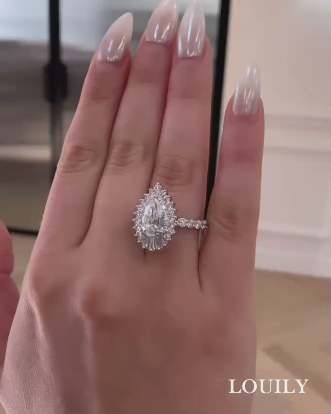 It offers a beautifully classic look that feels both romantic and refined. Featuring a 2.2-carat pear-shaped center stone surrounded by a sparkling halo, this design enhances brilliance while maintaining a soft, graceful silhouette. The vintage-inspired band is delicately crafted, adding texture and a touch of old-world charm.